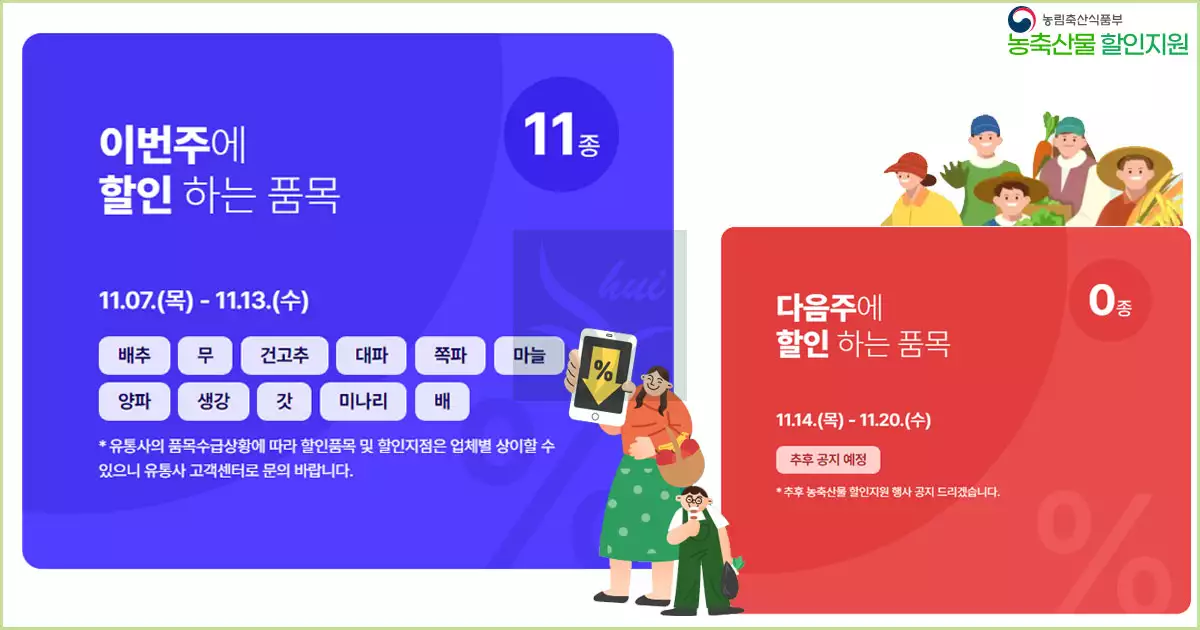 이번주 농축산물 할인지원 품목이다. 배추, 무, 건고추, 대파, 쪽파, 마늘, 양파, 생강, 갓, 미나리, 배 총 11종의 품목을 11월 7일 목요일부터 11월 13일 수요일까지 진행한다.