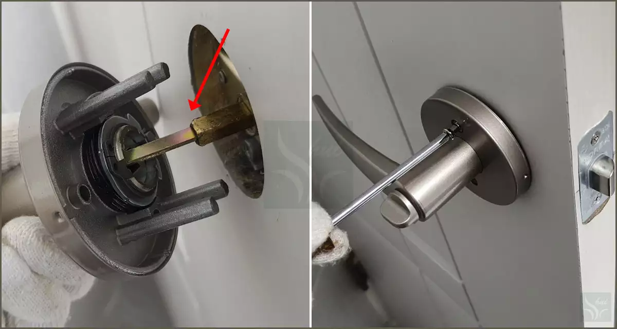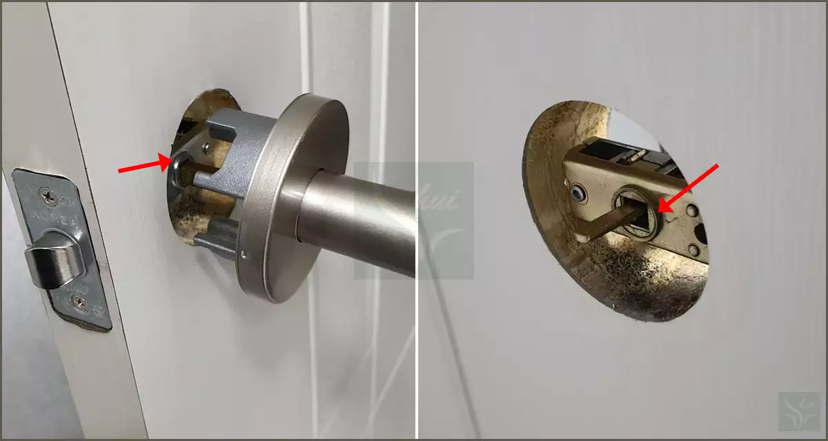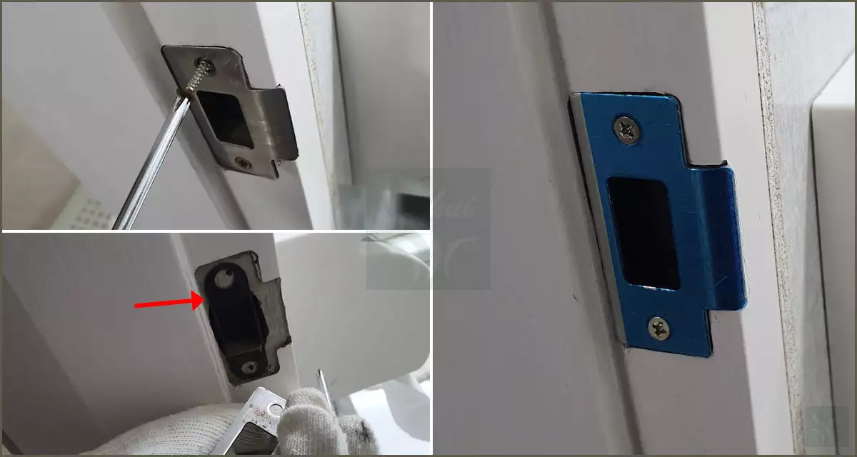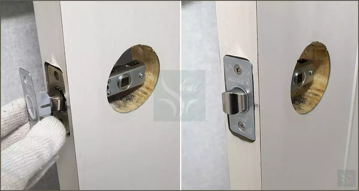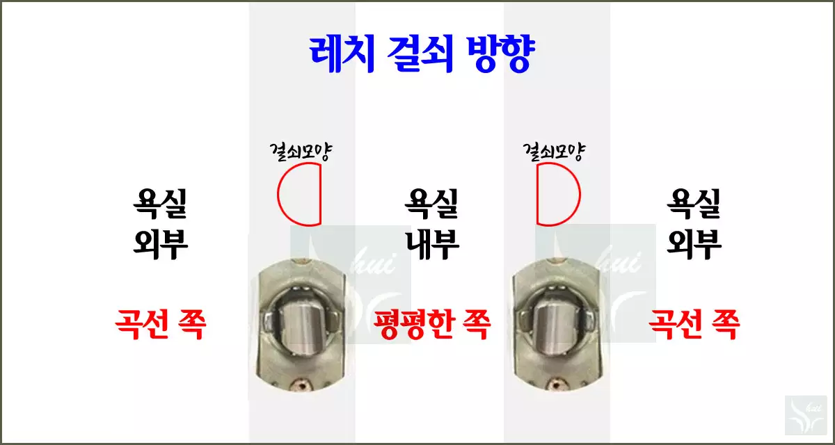 문이 열리고 닫힐 때 들어가고 나오는 위 사진에 보이는 부분을 걸쇠라고 설명되어 있었다. 저 걸쇠의 방향을 잘 보고 잠금 버튼이나 잠금 다이얼이 있는 쪽인 욕실 내부에는 평평한 쪽이 가도록 하고 밖에서 문을 따고 들어가는 방향인 바깥쪽은 둥근 곡선 쪽이 오도록 해야 한다.