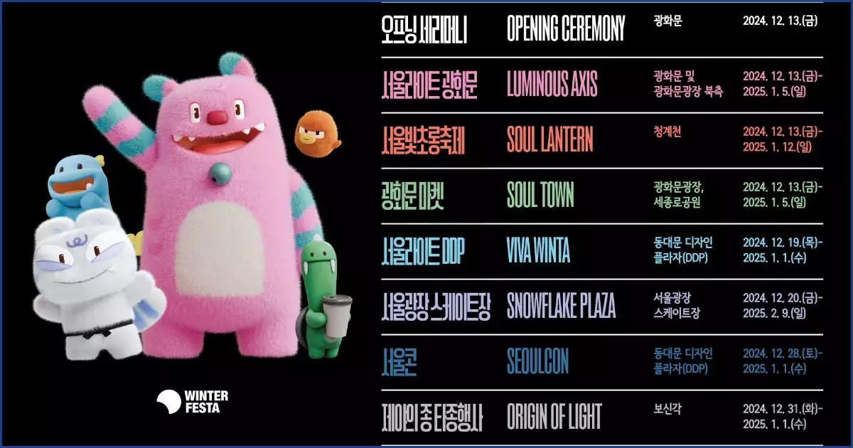 2024-2025 서울윈터페스타는 2024년 12월 13일, 광화문 개막식을 시작으로 서울의 명소 이곳저곳에서 진행이 된다. 개막식에서는 다양한 공연과 화려한 불빛이 어우러지면서 축제의 시작을 알린다.