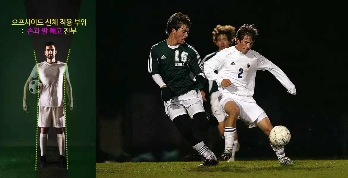 즉, 상대방 골문이 있는 우리 공격 진영을 말하며, 공을 패스하는 선수의 위치는 상관없다. - 상대 팀의 골키퍼와 그다음 수비선수보다 뒤에 있어야 한다.
