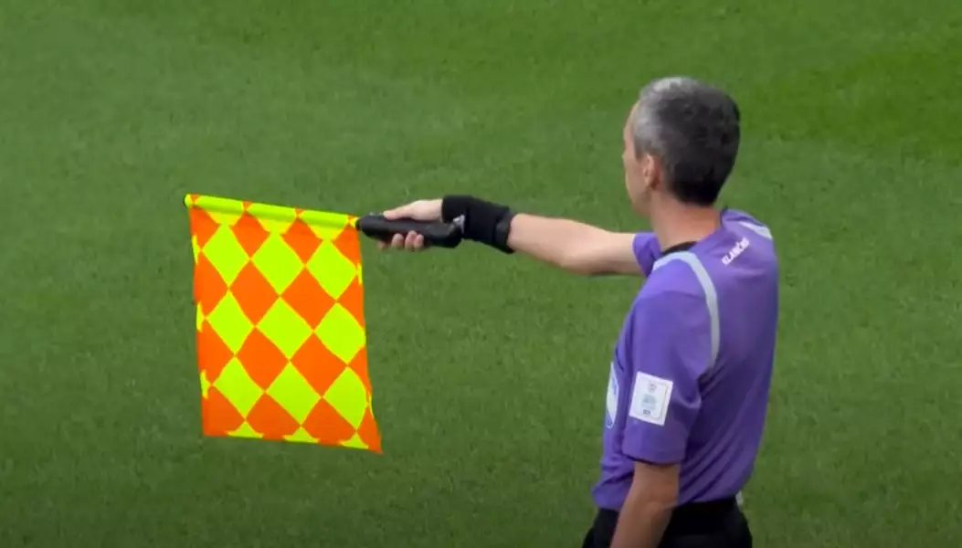 - 크로스 라인의 부심이 그 자리에 멈춰 서서 1차적으로 깃발을 들어 오프사이드를 선언한다.