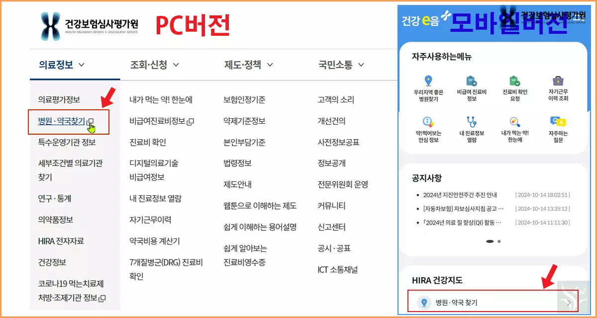 PC 버전은 상단의 메뉴바에 마우스를 대면 하위 메뉴가 나타난다. 의료정보의 '병원 ·약국 찾기'를 클릭한다.