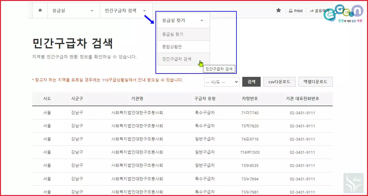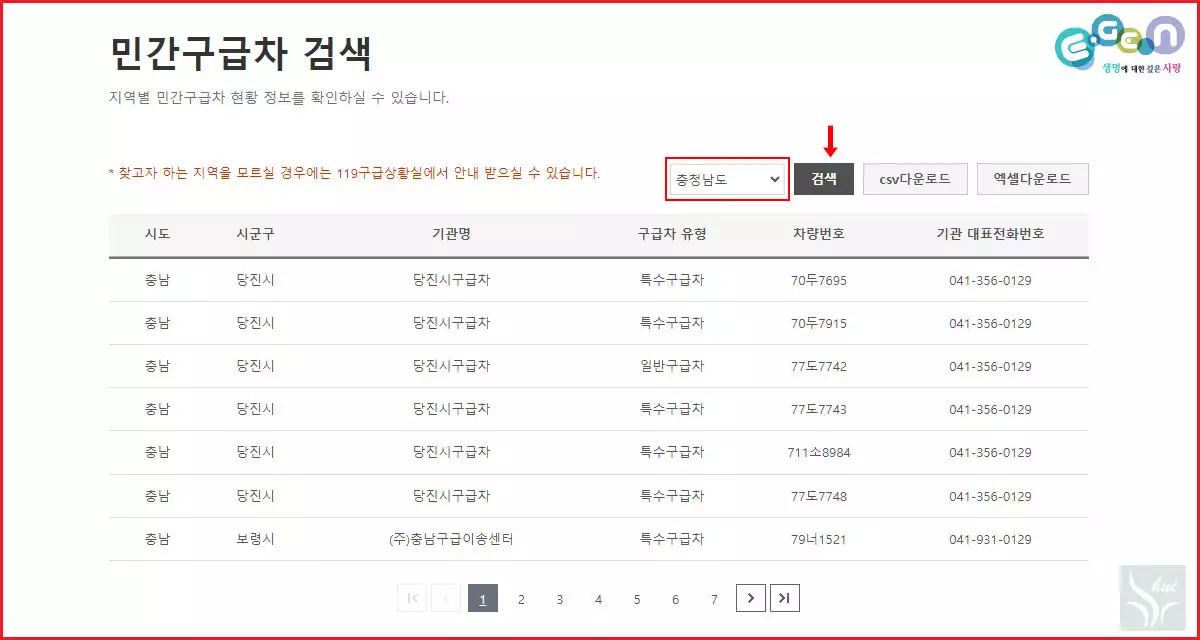 위와 같이 지역을 선택하고 검색 버튼을 누르면 내가 사는 지역의 민간 사설 구급차 기관을 확인할 수 있다.