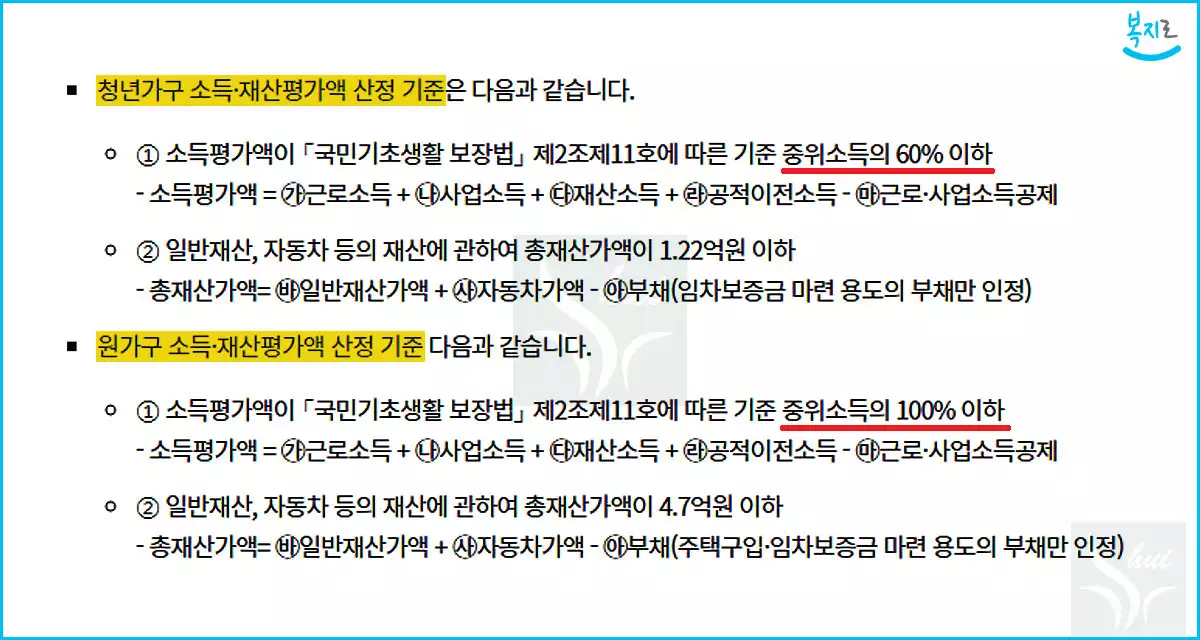 청년가구 소득 및 재산평가액 산정 기준과 원가구 소득 및 재산평가액 산정 기준은 위와 같다. 청년가구 소득은 중위 소득의 60% 이하, 원가구 소득은 중위소득의 100% 이하여야 한다.