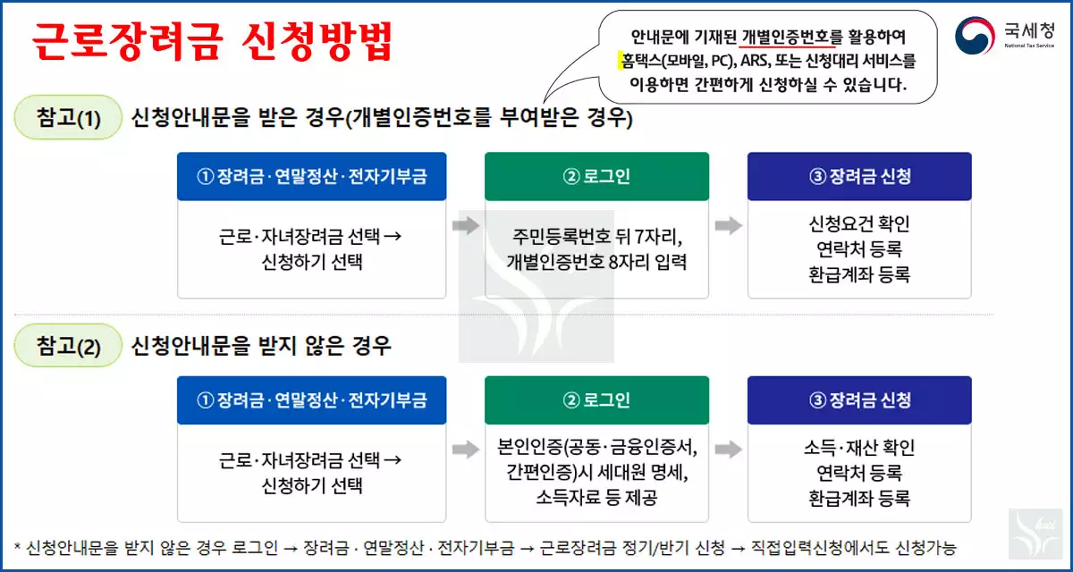 근로장려금 신청 안내문을 받은 경우에는 개별인증번호로 신청이 가능하며, 안내문을 받지 못한 경우에도 신청조건에 부합한다면 신청할 수 있다.
