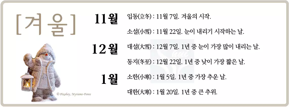 이제 마지막 11월, 12월, 1월까지의 겨울이다. 입동에서 대한으로 마무리된다.