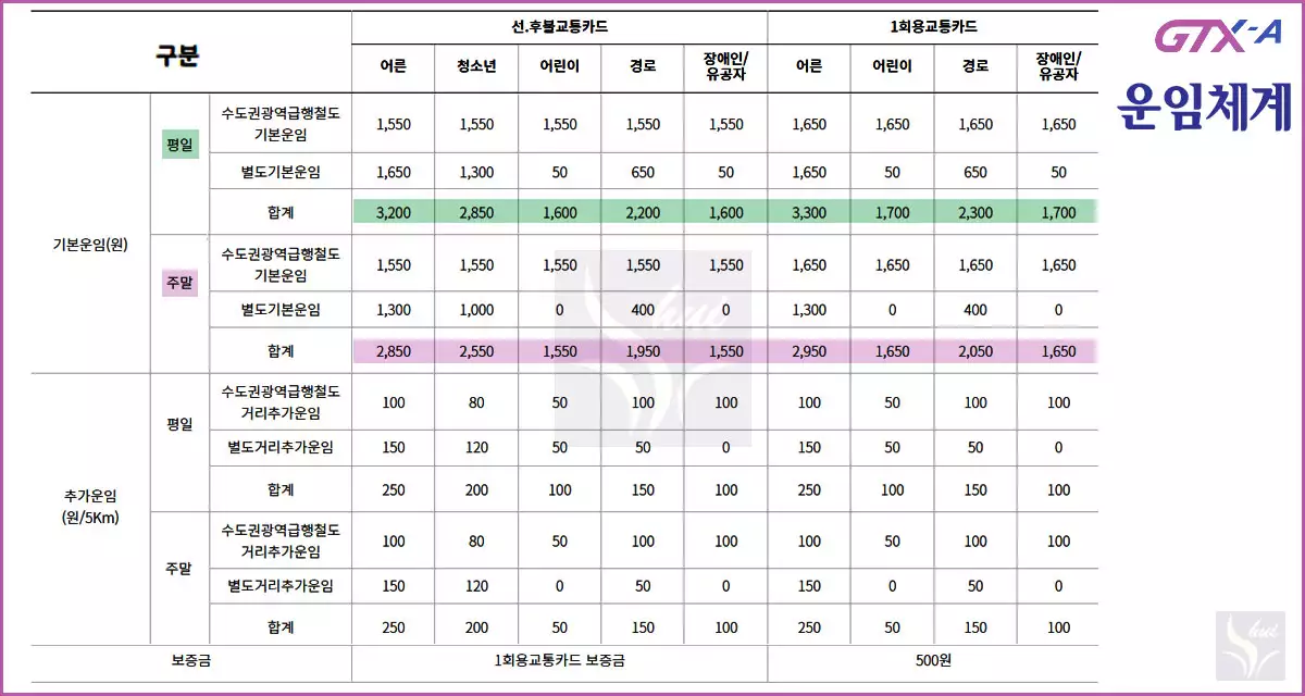GTX A 운정중앙역~서울역 구간별 소요시간 및 요금표 K패스 이용시?
