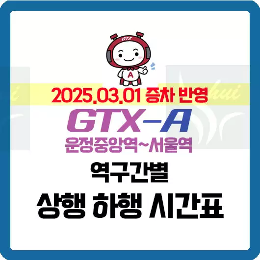 GTX-A 운정중앙역~서울역 구간이 2024년 12월 28일부터 개통되었다. (2025.3.1 증차 반영 시간표 update 완료) KTX가 생기고 SRT가 생기면서 전국을 빠른 시간에 이동할 수 있어 좋았는데, 이제는 파주에서 서울역까지 GTX를 타면 20여분으로 순간이동(?)을 할 수 있다. 경기도에서 출퇴근을 하는 분들이라면 바쁜 아침 출근시간이 그전보다 반절 이상 단축되는 효과이다.